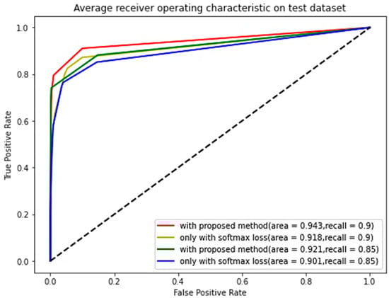 As shown in Figure 9, The true positive rate (TPR) and false positive rate (FPR) are obtained under different thresholds, and their ROC curves are described. The proposed method reaches the maximum AUC value of 94.3%, which is- higher than that from the CNN-AE with softmax loss (the AUC value of 92.1%) when the recall is 0.9. Therefore, there is a threshold that can obtain the highest TPR while keeping the FPR very low, making the target movements more distinguishable from unrelated movements. In addition, the discriminative deep features combined with simple AE can achieve rejection performance. According to Figure 6 and Figure 8, the center loss can compact intra-class variations and enlarge inter-class differences to improve rejection performance.