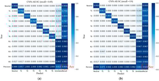 Figure 10 shows the confusion matrices by the proposed method (λ = 0.00025) and CNN-AE-S (λ = 0) when the recall factor is defined as 0.85 and 0.9, respectively. The confusion matrices averaged over all subjects with the proposed method on the test dataset are shown in Figure 10a,b. When the recall is 0.9, the mean classification accuracy is 92% and the rejection performance of unrelated motions reached 95% by the CNN-AE-SC method, which is higher than that (82.2% and 71.6%) from the CNN-AE-S. When the recall is 0.85, the mean classification accuracy is 92% and the rejection performance of unrelated motions reached 95% by the CNN-AE-SC method, which is higher than that (82.2% and 71.6%) from the CNN-AE-S. According to Figure 10, for the model trained with the CNN-AE-SC method, all misclassifications of target motions (A1–A6) are determined to be the unrelated pattern (R1–R5) by mistake, which leads to no response of the control system. However, for the model trained with the CNN-AE-S, there are some misclassifications of target movements determined to other target movements by mistake, which leads to abnormal movement of the control system because of the wrong recognition.