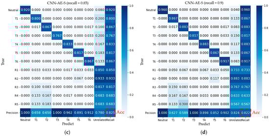 Confusion matrices averaged over all subjects: (a,b) Confusion matrices for the proposed method on the test dataset and all unrelated samples when the recall is defined as 0.85 and 0.9 (b); (c,d) Confusion matrices for CNN-AE-S method on the test dataset and all unrelated samples when the recall is defined as 0.85 and 0.9; Neutral and T1–T6 denote seven target movements, whereas R1–R5 denote rejection movements.