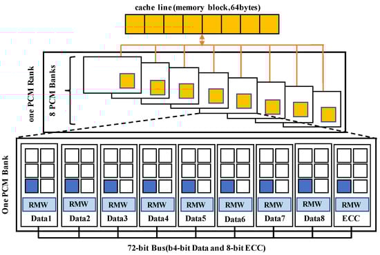 Among the different types of NVMs, PCM is regarded as a candidate for memory due to its Byte addressabilities such as DRAM, good scalability and low energy consumption. A PCM device has one or multiple channels, each of which is connected to a Dual In-line Memory Module (DIMM) and composed of one or multiple ranks. Figure 1 shows the basic structure of PCM, each rank is composed of eight banks, each of which can deal with memory requests independently. The data in a memory block (cache line) are distributed among eight banks, and each bank provides part of the data [22]. As shown in the bottom of Figure 1, a bank has eight data sub-blocks and one ECC (Error Correcting Code) block [23,24]. The ECC block is used to correct data faults during storage or transfer. When a memory request comes, the blocks provide 8 Bytes of data and 1 Byte of ECC data. These 8 Bytes (blue block in 8 data blocks) make up the small yellow block in the middle of Figure 1. It should be noted that PCM can write cells that are different between old and new data and do not write cells that are the same.