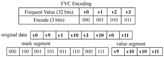 An example of FVC compression. The FVC encoding table at the top of the figure gives an example of frequent values and their encodes. The mask segment stores the encode or site of data, and the value segment stores the infrequently used value.