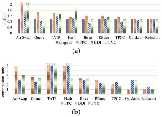 There are many studies on extending the lifetime of NVM, e.g., by keeping wear leveling among memory blocks [7,8,9,10], reducing the number of writes [11,12] or reducing the bit flips [13,14,15,16]. However, these methods often consume extra NVM space for the metadata, e.g., tag information in the most commonly used FNW method that is used to reduce bit flips [15]. Compression algorithms have already been used to save NVM space for existing lifetime extension methods [16,17]. The most popular memory compression algorithms include Frequent Pattern Compression (FPC) [18], Base-Delta-Immediate Compression (BDI) [19,20] and Frequent Value Compression (FVC) [21], which reduce the size of the data by de-duplicating or deleting consecutive “0” s and “1” s. However, the effect of compression algorithms themselves on NVM has not been studied in existing works.