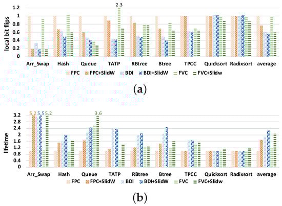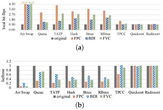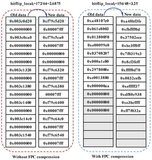 We define the local bit flips as the number of bit flips per unit area. The equation for calculating the local bit flips represented as is in Equation (1), wherein the n and i represent the total number and the times to write the sequence of writes, respectively. refers to the number of local bit flips in the write. and show the number of bit flips and the size of area in which these bit flips happen during the write. In the example of Figure 6, the local bit flips are calculated according to Equation (1). We find that the local bit flips increased after using FPC compression, which means that compression induces worse local wear on NVM blocks. In order to further describe the effect of local bit flips on the lifetime of NVM, the lifetime is defined as Equation (2). Endurance is the maximum number of writes that can be made in a cell.
