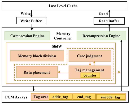 During the writing process, data would be first compressed in the compression engine. Then, compressed data would be dealt with in the SlidW module to decide how to place the data and process the data accordingly. At last, the data are sent to the PCM arrays to finish the write operation. During the reading process, data would be first read out together with the tag. According to the assistance of the tag management module in SlidW, address and status information would be identified and the data would be parsed and organized, then sent to the decompression engine to finish the reading process.