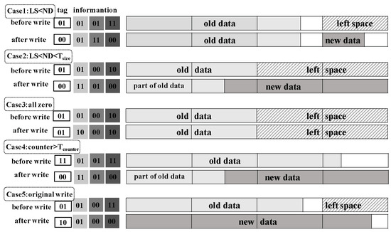 The process of the case judgement algorithm is shown in Algorithm 1, in which NSize is obtained by dividing the new data size by area size. For example, when the data size of the new data written is 35, NSize= = 3. When data and some supplementary information such as data size and tag information are sent to the case judgment part, it would first judge whether the data are all zero. In FPC and BDI, we can judge whether the data of the memory block is all zeros according to the data size because the data size of all zeros is fixed to a unique value. When the FVC algorithm is used for the other algorithm, that data size cannot be used to judge whether it is all zeros; thus, we need to judge it in the compression engine and pass this message to the case judgment module. For all zero data, case judgment will determine that this is Case3. Otherwise, case judgment will judge whether the data size is less than or equal to the set threshold . If so, case judgment decides the written case according to the size relationship among the left space, new data size and counter value. If the left space is larger than or equal to the new data size, case judgment will determine that this is Case1. Otherwise, if the left space is larger than zero, case judgment will determine that this is Case2. If still not, it will judge whether the value of the counter is greater than the threshold , if so, case judgment will determine that this is Case4. If the data size is smaller than , case judgment will determine that this is Case5. The decided case and the data size will be passed to the tag management module.