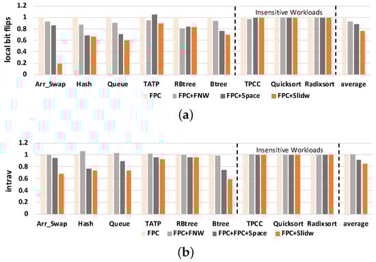 Comparison of NVM local bit flips and IntraV under four different methods. Results are normalized to FPC. (a) Results of local bit flips; (b) Results of IntraV.