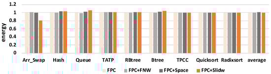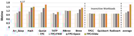 The results of NVM lifetime are shown in Figure 11. The figure shows that all three methods improve NVM lifetime compared with the baseline FPC method. On average, FPC+SlidW can improve NVM lifetime by 67.78% compared with FPC, by 55.63% compared with FPC+FNW and by 44.09% compared with FPC+space, respectively. According to Equation (2), lifetime is inversely proportional to local bit flips and proportional to endurance. As endurance is fixed, the lifetime results mainly relate to local bit flips. These results verify that our proposed method can effectively improve NVM lifetime.