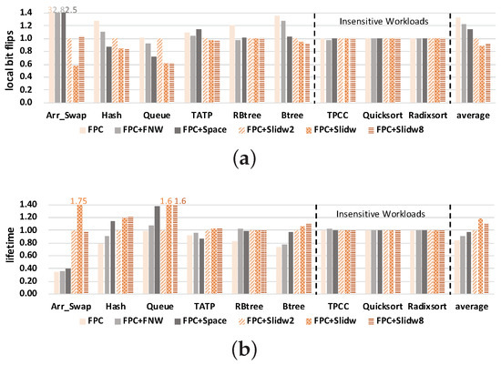 The results of local bit flips are shown in Figure 10a. The y-axis denotes the local bit flips, and all results are normalized to FPC. The figure shows that all three improved methods reduce the local bit flips compared with the baseline FPC method. For FPC+FNW, the local bit flips are reduced along with the reduction of bit flip number. Both Space and SlidW decrease the local bit flips by distributing the local wear into the whole memory block. On average, SlidW can reduce the local bit flips by 23.61% in FPC, by 17.98% in FPC+FNW and 13.09% in FPC+Space. Compared with FPC+FNW, the effect of SlidW on relieving the local wear is more obvious. This is because it can put data into more space. This means that the benefit is quite limited to reducing local bit flips by only reducing bit flips.