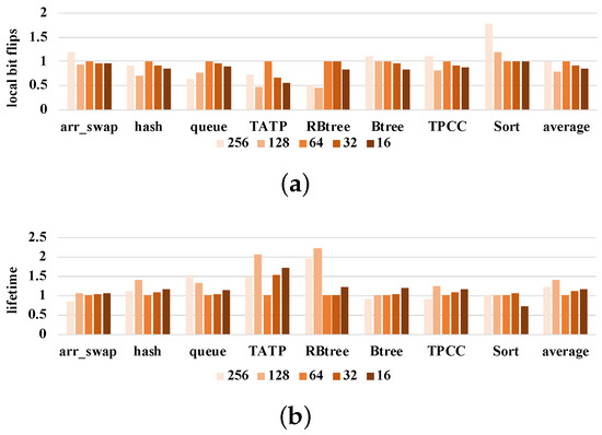 Study results of SlidW on different block sizes. These results are normalized to 64 bytes. (a) Results of local bit flips. (b) Results of NVM lifetime.