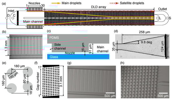 We designed a device comprising step emulsification nozzles and DLD micropillar arrays, as shown in Figure 1a. This device has a symmetric layout on both sides of the central wall. Two inlets for the dispersed and continuous phases are located in the upstream region of the device. Subsequently, 30 step-emulsification nozzles are arranged in two arrays (i.e., 60 nozzles in total) perpendicular to the main channel. A periodic array of DLD micropillars in the downstream region is arranged in the main channel, which leads to two outlets for collecting the main and satellite droplets separately. A device without pillars was also prepared for comparison (see Supplementary Materials, Figure S1).