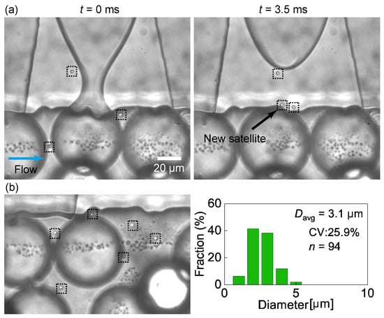 Formation of satellite droplets. (a) Snapshots of the satellite droplets (in the dashed squares) around a nozzle taken before (t = 0 ms) and after (t = 3.5 ms) the break-off of a main droplet. (b) Satellite droplets flowing around the nozzle edge and their size distribution. Flow rates were Qd = 0.1 mL/h and Qc = 10.0 mL/h.
