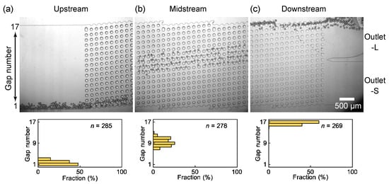 Spatial distribution of main droplets flowing through the DLD pillar arrays. (a) Main droplets entering the DLD region near the side wall. (b) Main droplets flowing through the midstream region in displacement mode. The droplets were counted in the 14th DLD section. (c) Fully displaced main droplets entering outlet-L. Flow rates were Qd = 0.1 mL/h and Qc = 10.0 mL/h.