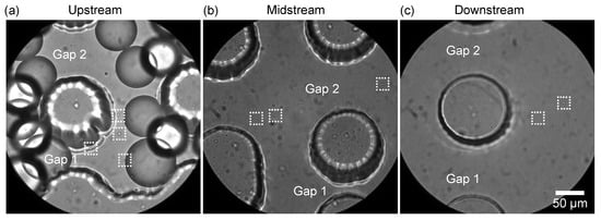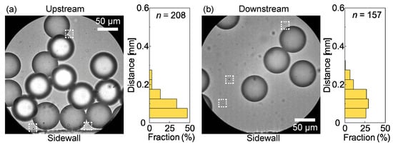 Satellite droplets flowing in the no-pillar device. (a) The satellite droplets (in the dashed white squares) flowing in the (a) upstream and (b) downstream regions and their distances from the sidewall. Flow rates were Qd = 0.1 mL/h and Qc = 10.0 mL/h.