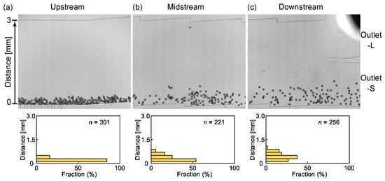 Spatial distribution of main droplets flowing in the no-pillar device. (a–c) Main droplets flowing through (a) the upstream region immediately after the nozzles, (b) midstream region, and (c) downstream region before the outlets. Flow rates were Qd = 0.1 mL/h and Qc = 10.0 mL/h.