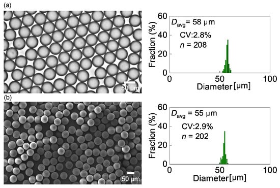 Collected main droplets and polymeric microspheres. (a) A photomicrograph of the main droplets collected from outlet-L and their size distribution. (b) An SEM image of the UV-polymerized particles and their size distribution.
