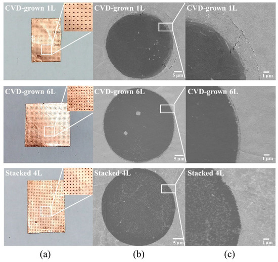 The optical image of the suspended graphene array is shown in Figure 1a. After Cu etching, the suspended graphene array can already be seen, while the Cu foil remains intact. Figure 1b,c present SEM images of suspended graphene with different numbers of layers and different preparation methods as well as a plot of magnification. The CVD-grown monolayer (1L) graphene can be successfully suspended over circular holes with a diameter of 50 µm. However, it can be seen that the corresponding film is in a poor state. There are many small cracks in the film at the edge of the pores. In comparison, the CVD-grown 6-layer (6L) graphene is in excellent condition without cracks on the whole area over the circular hole with a diameter of 50 µm. Similarly, the stacked 4-layer (4L) graphene film can be well suspended over the whole suspended area. However, during the stacking process, more small impurity residues can be observed on the surface of the stacked 4L graphene film. By checking the surface morphology of the graphene after stacking in Figure S2, it was observed that there were few residual particles of thermal release adhesive. The residue was in diameter of less than 0.5 µm, and the particles existed independently of each other which would not form a connected network or film.