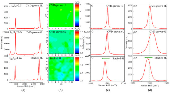 (a) Raman spectra for CVD-grown 1L, CVD-grown 6L, and stacked 4L, respectively. (b) Raman mapping of the ratio I2D/IG. (c) Enlarged G peaks in the Raman spectra and (d) enlarged 2D peaks in the Raman spectra.