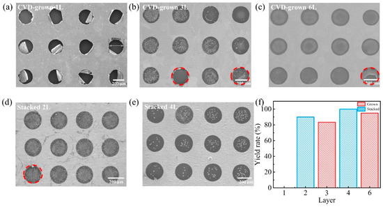 Figure 3 compares the SEM images of CVD-grown 1L, 3-layer (3L) and 6L versus stacked 2-layer (2L) and 4L suspended on the holes with a diameter of 200 µm. The survival rates are summarized in Figure 3f. As shown in Figure 3a, all monolayer graphene films were broken during fabrication and some of the broken graphene remained in the holes with a hole diameter of 200 µm. The phenomena might be caused due to the weak mechanical strength of monolayer graphene film which is unable to survive during the drying process [46]. This problem can be improved by increasing the layers of CVD-grown graphene film. As shown in Figure 3b,c, the survival rate of CVD-grown 3L graphene film reaches 83.3% and that of CVD-grown 6L graphene film reaches 90%, which is significantly higher than that of the monolayer graphene film. As observed in Figure S4a,b, although the CVD-grown 3L graphene film was able to survive, the liquid surface tension during the wet etching and photoresist removal process resulted in small cracks in the CVD-grown 3L graphene film. In contrast, the CVD-grown 6L graphene film does not have small cracks.