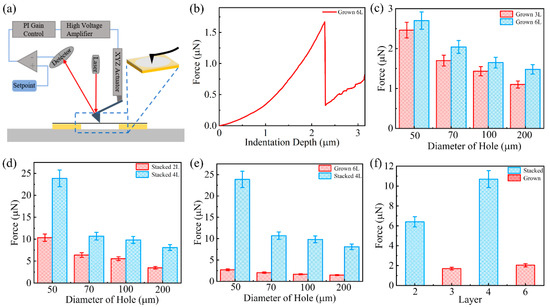 (a) Scheme of nanoindentation test on the suspended graphene film using AFM; (b) nanoindentation force vs. displacement curve measured on a typical CVD-grown suspended graphene with a diameter of 200 µm. (c) Comparison of the nanoindentation test results between the CVD-grown 3L and the CVD-grown 6L. (d) Comparison of the nanoindentation test results between the stacked 2L and the stacked 4L. (e) Comparison of nanoindentation test results with CVD-grown 6L versus stacked 4L. (f) Comparison of nanoindentation test results between CVD-grown graphene film and stacked graphene film with different layers suspended on holes with a diameter of 70 µm.