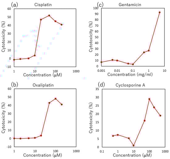 Concentration–cytotoxicity curve measured using the LDH assay kit after 96-h incubation. (a) Cisplatin; (b) Oxaliplatin; (c) Gentamicin; (d) Cyclosporine A.