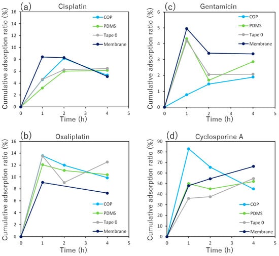 Time course of each nephrotoxic drug adsorption onto each material used in MPS. (a) Cisplatin; (b) Oxaliplatin; (c) Gentamicin; (d) Cyclosporine A.