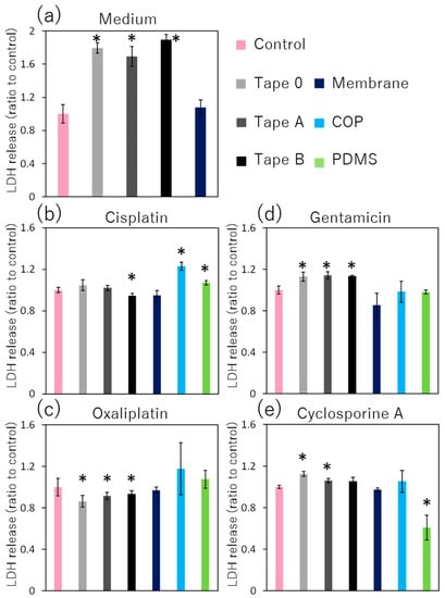 To examine the reduction of cytotoxicity through the adsorption of drugs onto each material, the amount of LDH was compared to a control sample, which was immersed with no material. Each medium immersing of three different types of adhesive tape showed cytotoxicity without any drugs. However, the medium that immersed the porous membrane did not show any cytotoxicity (Figure 3a). In the case of medium containing cisplatin, the cytotoxicity of Tape B decreased, but that of COP and PDMS increased compared to a control sample, which was immersed without any materials (Figure 3b). In the medium containing oxaliplatin, the cytotoxicity of every type of adhesive tape decreased, but that of the COP, PDMS, and porous membranes did not change (Figure 3c). In the case of medium containing gentamicin, every type of adhesive tape showed increased cytotoxicity; however, COP, PDMS and the porous membrane showed no such changes (Figure 3d). In the medium containing cyclosporine A, the cytotoxicity of Tape 0 and Tape A slightly increased, but that of PDMS decreased dramatically (Figure 3e).