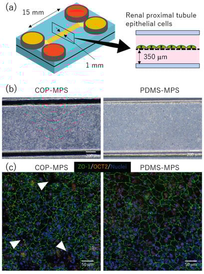 RPTEC cultured in COP-MPS and PDMS-MPS. (a) Schematic diagram of MPS structure; (b) Phase-contrast images of RPTEC; (c) Immunostaining images of ZO-1 (green), OCT-2 (orange), and nuclei (blue). White arrowheads indicate faint signals of ZO-1.