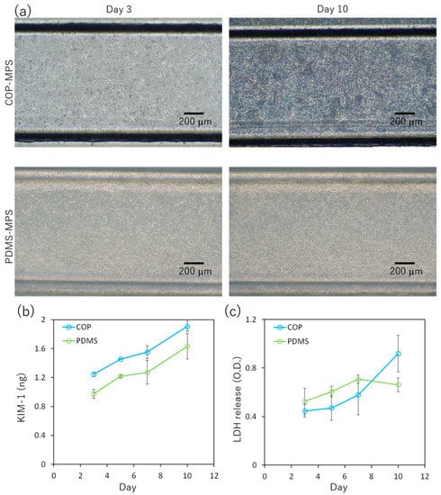 Figure 5a shows RPTEC cultured in COP-MPS and PDMS-MPS on days 3 and 10. In both systems, RPTEC reached confluence on day 10; however, the amount of KIM-1 released from RPTEC in COP-MPS was slightly higher than that in PDMS-MPS, indicating that COP-MPS had greater cytotoxicity (Figure 5b). The amount of LDH from RPTEC in COP-MPS was lower than that in PDMS-MPS until day 7. However, on day 10, the amount in COP-MPS increased sharply (Figure 5c).