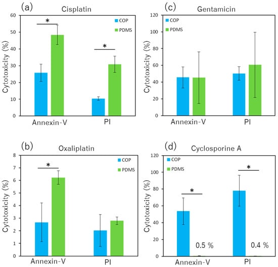 Cytotoxicity of each nephrotoxic drug on RPTEC cultured in COP-MPS and PDMS-MPS. (a) Cisplatin; (b) Oxaliplatin; (c) Gentamicin; (d) Cyclosporine A. Data are presented as mean ± SD (technical replicates, n = 3). * p < 0.05.