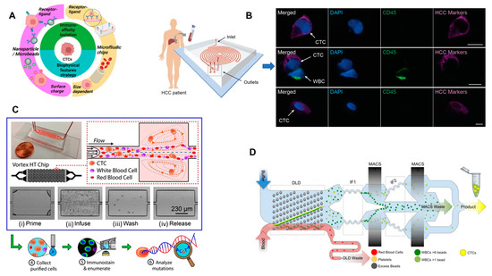 (A) Schematic demonstration of different isolation techniques for circulating tumor cells (CTCs). Adapted and reprinted with permission from [7]. (B) Labyrinth microfluidic device for the identification and quantification of CTCs isolated from cancer patients. Adapted and reprinted with permission from [14]. (C) Microfluidic Vortex HT chip for the isolation and detection of CTCs. Adapted and reprinted with permission from [15]. (D) Schematic representation of the monolithic CTC-iChip for the isolation of CTCs from the blood sample. Reprinted with permission from [19].