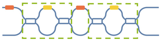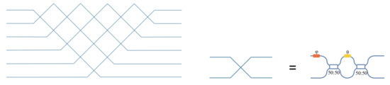 In 2016, Clements et al. [23] proposed a rectangular mesh, which was an improvement of the triangular mesh of Reck, as shown in Figure 3. Compared to the triangular mesh of Reck, the rectangular mesh has higher symmetry and a lower optical loss difference of each output. Additionally, the longest optical depth of the rectangular mesh is about half that of the triangular mesh, and the total optical loss is only half that of the triangular mesh.