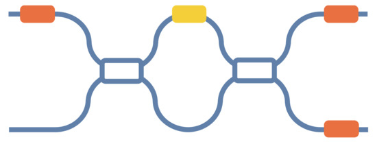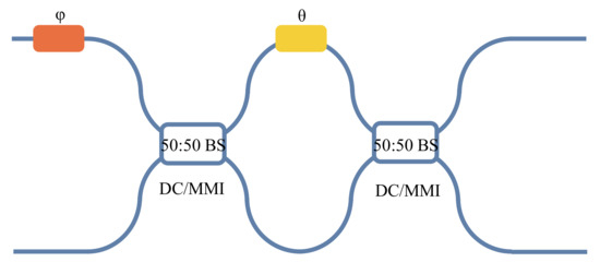A common Mach–Zehnder interferometer consists of an external phase shifter (φ), an internal phase shifter (θ), and two 50:50 beam splitters (directional couplers (DC)) or multimode interference couplers (MMI)), as shown in Figure 2.