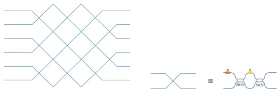 In 1994, Reck et al. [24] proposed one type of triangular mesh based on the Mach–Zehnder interferometer and demonstrated that the unitary matrix transformation of any finite dimension could be implemented by MZI devices. They decomposed the N-dimensional unitary matrix into a series of two-dimensional unitary matrices, which were presented as a triangular mesh formed by the arrangement of MZIs, as shown in Figure 1.