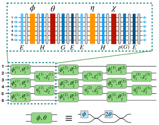 - Clements, W.R.; Humphreys, P.C.; Metcalf, B.J.; Kolthammer, W.S.; Walsmley, I.A. Optimal design for universal multiport interferometers. Optica 2016, 3, 1460. [Google Scholar] [CrossRef]