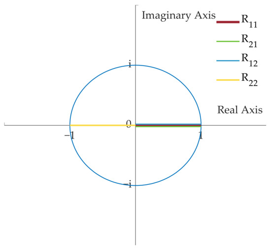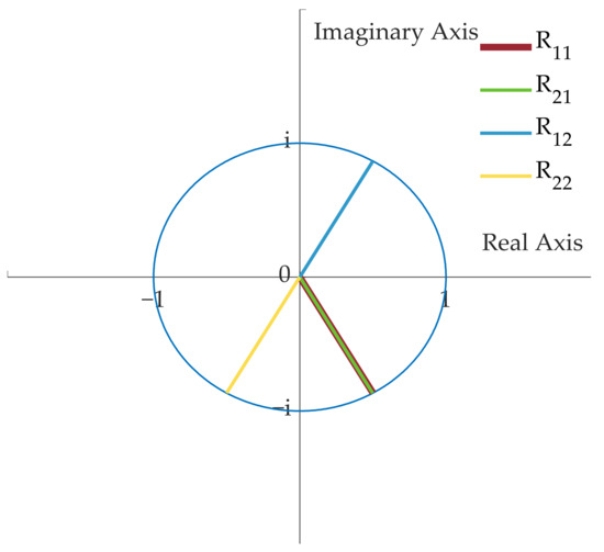 where, . The corresponding output optical phase of the four elements in the matrix R′ can be represented on a complex plane, as shown in Figure 10.