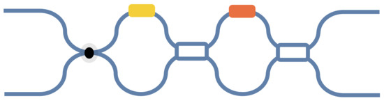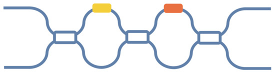 Based on the above works, Hamerly et al. [20] proposed two MZI architectures (Figure 11 and Figure 12). One is of a three-splitter MZI, which can correct generic errors and achieve a full range of split ratios. To realize the full range of the split ratio, it changes the position of “forbidden regions” caused by the error of the beam splitter, which are some unitary matrices that cannot be implemented because of the beam splitter error. The “forbidden regions” are displaced away from the cross state, rather than being eliminated completely. However, similarly to the architecture proposed by Suzuki, it does not completely correct the transmission matrix of the MZI. Furthermore, this MZI architecture does not incorporate an external phase shifter. Therefore, when it is formed into a mesh, it cannot correct the phase error from the previous layeR′s MZIs.