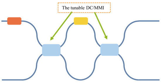 Here, we propose a new MZI architecture, where we replace the 50:50 beam splitter in the common MZI with a tunable DC/MMI that takes into account hardware error correction and mesh size, as shown in Figure 14. This improves the computational precision of the MZI’s mesh without increasing its size. By adjusting the split ratios of the tunable DC/MMI, we can eliminate its split ratio deviations from 50:50. For instance, for a tunable MMI, when the phase of optical fields at the position of the four-fold images in the multimode interferometer is altered, it affects the interference results of the optical fields, culminating in changes in the intensity of the two images at the two-fold image position. This enables the adjustment of the beam split ratios. The tunable MMI has the theoretical capability to adjust split ratios from 100:0 to 0:100, enabling the adjustment of any fabricated power split ratios in the physical 2 × 2 MMI to the ideal 50:50 split. This correction completely eliminates beam splitter errors and enables high-precision MZI-based matrix computation.