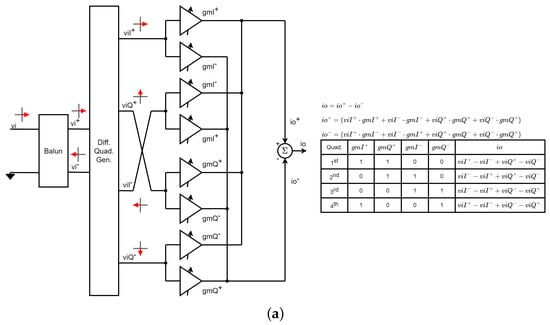 The architectures in Figure 2a–c use single-ended signals. However, it is generally preferred to work with differential signals to improve the common-mode rejection ratio. Figure 3a shows a commonly used differential VSPS based on a double Gilbert-cell structure. First, a balun converts the single-ended input signal to differential mode and then a differential quadrature generator generates the in-phase and quadrature differential versions of the input signal. Two Gilbert cell-type variable gain amplifiers (VGAs) are then used to create the final vector by adding the current-domain signals at the output nodes with appropriate gains to give the desired phase. This architecture requires at least four digital to analog converters (DACs), one for each VGA that is active at any given time [6,7]. However, for each quadrant, only two different gains need to be controlled, so by switching the DAC that controls each gain, only two DACs are needed. This technique is commonly used to reduce the number of DACs needed [8,9,10,11,12,13,14,15,16,17,18,19,20,21,22,23,24,25,26,27,28,29,30,31].