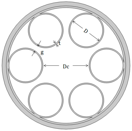 Figure 2 shows the schematic diagram of the classic six-tube HC-AR fiber, which has more confinement loss compared with classic six-tube nested HC-AR fiber, because it has one less layer of the anti-resonant tube. However, its simple construction and easy processing make it convenient for theoretical simulation. With only one layer of anti-resonant tube, the independent parameters that affect the fiber structure are only when the number of tubes is six, and the diameter of the anti-resonant tube D can be determined by Equation (1) using the parameters .