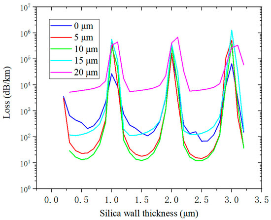 The number of cladding tubes () was six in this simulation; the gray area represents quartz, and its refractive index was determined by Sellmeier’s formula. The material represented by the white area is air, with a refractive index of 1.0. The wavelength was set to 2 μm. According to known research, the core diameter of optical fibers is generally set to be about 30 times the wavelength [7], so the core diameter was set to be 55 . Using Equation (2), it can be inferred that the first-order and the second-order anti-resonance thicknesses are 0.48 μm and 1.46 μm, respectively. In order to determine the best silica strut thickness and simulate the influence of optical fiber thickness on confinement loss, we calculated the confinement loss of the geometric model in Figure 2 with different silica wall thicknesses and different gap distances The results are shown in Figure 3.