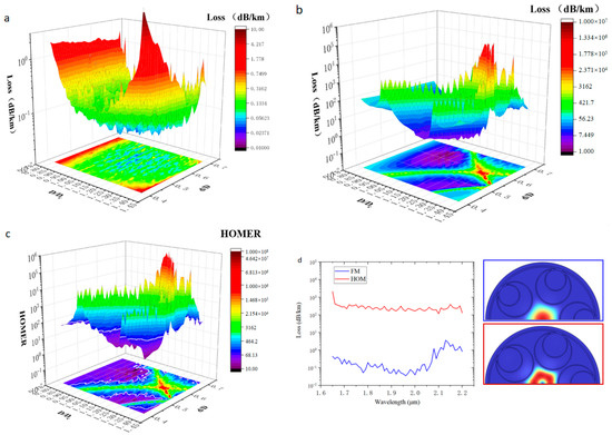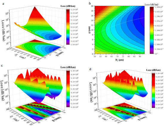 The core radius of an HC-ARF has a crucial influence on the loss, and it can even determine the loss magnitude of the optical fiber. Although the loss is inversely proportional to the diameter of the core, it is limited to attaining low loss by increasing . With the increase in , the loss of higher-order modes will also decrease, which is unfavourable for single-mode propagation, Therefore, is an important index for optimizing HC-ARF. Figure 4 shows the confinement losses and HOMER corresponding to different core diameters and different gap distances.