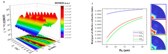 Figure 4a shows that the confinement loss decreases sharply with the increase in the core diameter, and the white dotted line in Figure 4b marks the lowest loss of different core diameters and shows different gap distances corresponding to different core diameters when the lowest loss occurs. Coincidentally, when the loss is the lowest, the ratio of the diameter of the anti-resonant tube to the diameter of the fiber core happens to be about 0.66. As a comparison, when = 90 μm, the lowest confinement loss is 0.89 dB/km, while the loss reaches up to 20.85 dB/km at 50 μm. Although the simulation shows that a larger core diameter performs better in terms of confinement loss, the loss of the higher-order mode will also increase with the increase in the core diameter. Figure 4c shows the confinement loss of the mode, which has the lowest loss in propagation compared with other higher-order modes. Figure 4e shows the calculated HOMER, which is defined as the ratio between the lowest confinement loss of the HOM and the confinement loss of FM [9,21]. Current studies suggest that the extinction ratio of hollow-core anti-resonant fiber to higher-order mode should be at least above 100 to have an ideal pseudo-single-mode propagation performance [26]; the white line is the contour line when HOMER is 100. From the figure, it can be seen that there is a wide range on both sides of the gap of the optimal anti-resonant tube, and no matter how large the diameter of the core is, good quasi-single-mode propagation can be achieved. Therefore, the decrease in HOMER is not the factor that limits the core diameter. Figure 4f shows the real part of the effective refractive index of , and modes.