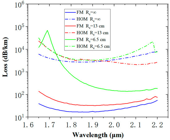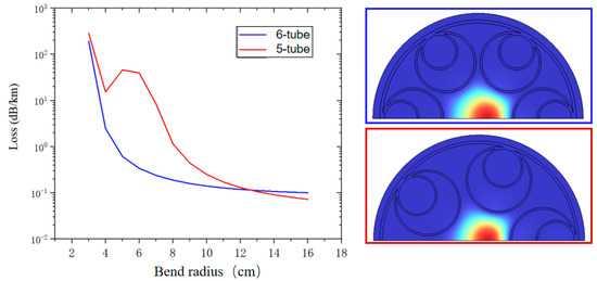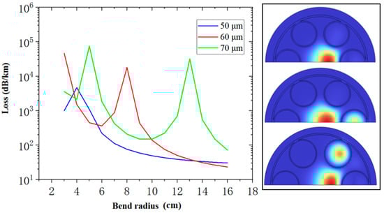 The loss peak observed in the figure is due to the mode coupling between the core and the cladding tube mode, as shown in the calculated modal field profile on the right-hand side. Although the simulation of straight fiber shows that the larger the core diameter, the lower the loss, the simulation of bending loss indicates that a larger core diameter leads to more bending loss. However, bending is inevitable in the normal operation of the optical fiber; thus, the core diameter should not be increased indefinitely. Figure 6 shows the confinement loss in fiber when = ∞, = 13 cm, and = 6.5 cm, while is kept to 50 µm.