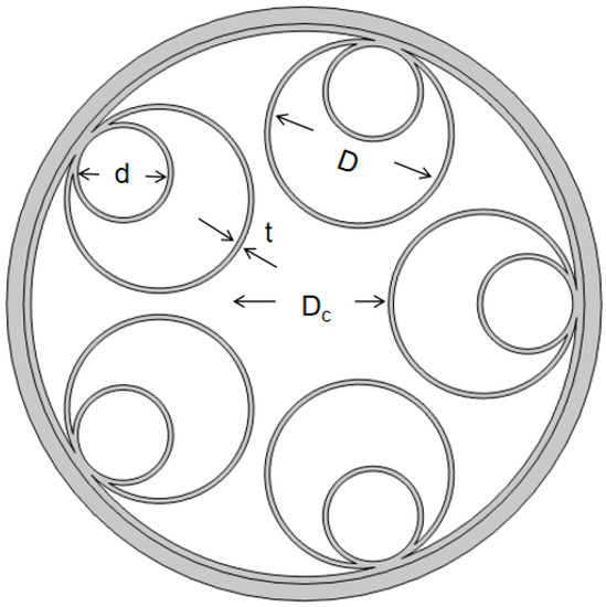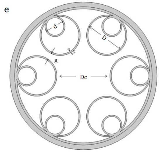 Figure 1 shows the geometry of the six-tube nested HC-ARF that we analyzed, where is the core diameter, i.e., the diameter of the largest inner circle in the middle of the anti-resonant tube. The core radius of the HC-ARF has a crucial influence on the confinement loss. The loss is inversely proportional to the core diameter, but the way to obtain low loss by increasing is not without limitations, and the higher-order mode loss in the fiber will also decrease with the increase in , which is harmful to the single-mode transmission of the optical fiber. d is the diameter of the inner anti-resonant tube, is the gap distance between the anti-resonant tubes, and the contact points between the anti-resonant tubes are called nodes. Although the cladding of this fiber structure with nodes is more blocked and there is no gap, it has been shown that these nodes will produce Fano resonance when the light travels through the fiber, which increases the loss of the fiber and adversely affects the transmission of the fiber [24]. A nodeless design can provide better loss attributes. However, excessively large g will lead to light leakage. D is the diameter of the anti-resonant tube, and its numerical calculation formula is as follows: