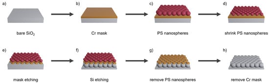- Van Minh, N.; Van Hieu, D.; Van Tuan, P.; Dung, N.D.; Hoang, C.M. Characteristics of silicon nano-pillars fabricated by nano-sphere lithography and metal assisted chemical etching. Mater. Sci. Semicond. Process. 2022, 142, 106483. [Google Scholar] [CrossRef]