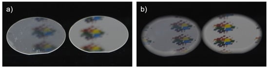 This becomes even clearer in the second attempt that was performed to investigate the AR properties of the patterned lens sample. Here, the 6 mm aperture was omitted. The lens sample was attached directly in front of the integrating sphere using adhesive tape. In this attempt, it is difficult to control the orientation of the lens, which causes deflections in the optical path. However, the measurement spot is larger, which allows for a more general estimation of the AR effect of the lens sample. Furthermore, by placing the lens directly in front of the integration sphere, the transmissive scattered light can also be detected. The measured results are shown in Figure 9b. They show an obvious AR effect over the entire measurement spectrum. This confirms the assumption that, towards shorter wavelengths, losses are mainly caused by transmissive scattering instead of increasing reflection. In both attempts to evaluate the patterned lens, a strong improvement in transmission due to a significant AR effect was observed.