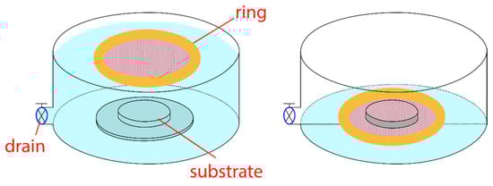The method for preparing the PS monolayer is an improved version of the Langmuir-Blodgett (LB) method []. Instead of moving mechanical barriers, like in the standard LB process, the compression of the PS spheres is induced by surfactant functionalization. 100 µL of the original suspension is diluted with 1100 µL of ethanol. Subsequently, 5 µL of hexylamine is added for the surface functionalization of the PS nanospheres. The mixture is then sonicated for 30 min. The sample is immersed beneath the water of a Petri dish, and 100 µL of the prepared suspension is slowly injected into the water surface by a syringe. The PS nanospheres spread over the water surface and form a loose monolayer. Then, ca. 50 µL of a 10 wt% sodium dodecyl sulfate (SDS) water solution was injected with another syringe at the edge of the Petri dish. The SDS molecules form a monolayer and dynamically self-assemble themselves during the deposition, so that the pressure at the edge of the PS nanospheres is maintained. The loose PS sphere monolayer is compressed by the SDS and aligned in a hexagonal pattern by the effect of Van der Waals forces. A slow sinking of the water level enables their deposition on the underlaying sample (see Figure 3).