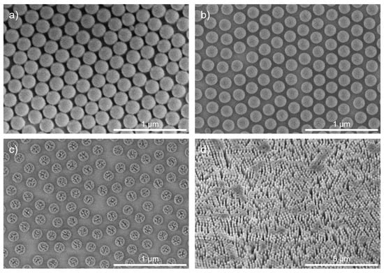The generated monolayer on the sample serves as a template for transfer into an underlaying 30 nm thick Cr layer. The period of the hexagonal pattern is defined by the diameter of the nanospheres. After the deposition, an O2 plasma etching step is performed in a RIE plasma etcher SI 591 from SENTECH Instruments GmbH. This shrinks the spheres into a desired size while they remain in their respective positions, and the period stays fixed (see Figure 4). This creates a sufficiently large etch aperture through which the subsequent etching process can attack and form separated structures. If this step is not performed, undesirable contiguous structures result, as shown in Figure 4d. It is important to optimize the amount of shrinkage, so that, on the one hand, the structures are well-separated from each other, and, on the other hand, sufficient etch masking material remains. This can be controlled by selecting the appropriate etching time. For the O2-RIE process, a standard recipe for the etching of organic photoresists with an RF power of 50 W and an O2 gas flow of 50 sccm was chosen. The shrinkage of the organic PS nanospheres is time-dependent. Figure 5 shows the measurements of the diameter of the shrunk PS spheres inspected with scanning electron microscopy (SEM). It shows a linear dependence between etching time and diameter. Variations in terms of shrinkage were observed for different sample sizes, which must be considered when setting the etching time.