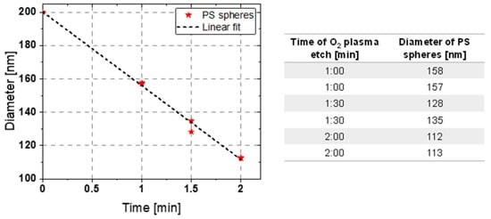 PS shrinkage after O2 plasma etching step with respect to the process time on different 2-inch wafer samples.