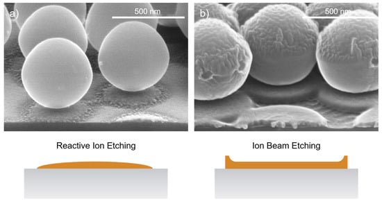 For the transfer of the mask into the Cr layer, the choice of the etching technology is decisive. The applied chlorine RIE process (2 min, Cl2 50 sccm, O2 10 sccm, RF power 100 W) with its isotropic etching component shapes the Cr mask so that it has a slightly descending, rounded sidewall on the outside. This forms the basic shape for the structure profile that can subsequently be transferred into the underlaying fused silica substrate by a stretched proportional transfer. If an ion beam etching (IBE) process with only a physical etching component were used for the transfer instead, the resulting redeposits would produce mask profiles with a slightly outwardly increasing shape. These mask profiles would not be suitable for the following ICP-RIE process. This issue is illustrated in Figure 6, showing PS spheres with 600 nm period on a 30 nm thick Cr layer deposited on a silicon substrate, as silicon is clearly easier to image in an electron microscope than fused silica is. Of the two samples, one was etched with RIE and the other with IBE. The differences in the resulting shape of the Cr masks on the two samples are clearly visible.